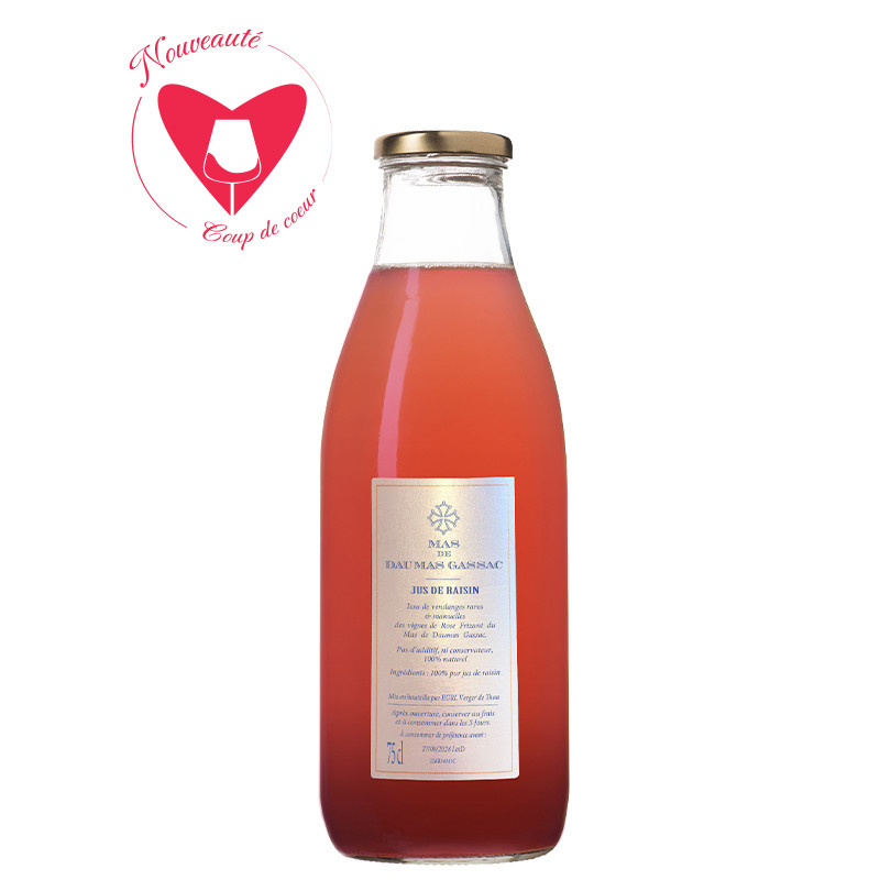 Jus de raisin issu de vendanges manuelles des vignes du Mas de Daumas Gassac Rosé Frizant. Pas d'additif, pas de conservateur : pur jus de raisin, 100% naturel !